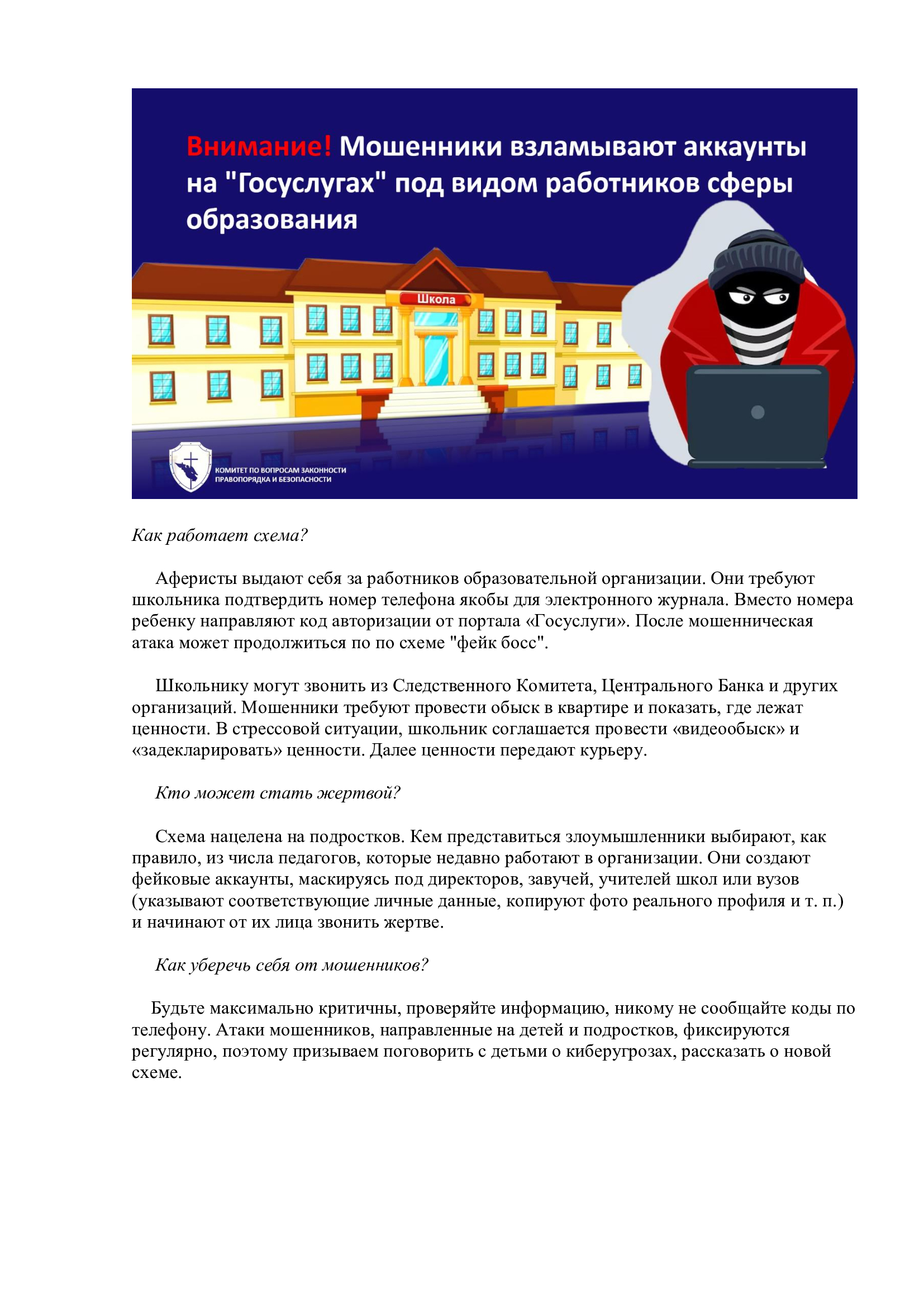 - осуществление телефонного звонка от имени любого должностного лица правоохранительных органов (МВД, ФСБ, прокуратуры), Центрального банка России, службы безопасности конкретного банка. В ходе разговора мошенники, зная ФИО потерпевшего и наличие у него банковского счета в конкретном банке, то есть обладая персональными данными потерпевшего, сообщают ему о попытке хищения денежных средств с его счета, чем вводят его в тревогу относительно утраты нажитого имущества. При этом, оказывая психологическое воздействие, сообщают единственный выход из сложившейся ситуации — перевести деньги на «безопасный государственный счет» на период установления и задержания виновного лица, после чего убеждают потерпевшего снять деньги со своего счета и зачислить их в банкомате на продиктованный счет. В подтверждение своих слов о причастности к государственным органам, преступники демонстрируют потерпевшему с помощью различных мессенджеров документы государственных органов или служебные удостоверения, которые в действительности являются фиктивными. Аналогичным способом преступники убеждают потерпевших оформить на свое имя кредит, денежные средства перевести на «безопасный счет», после чего они похищаются.