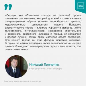 В Комитете по градостроительству и архитектуре сегодня объявлен старт всероссийского архитектурного конкурса на эскизный проект памятника Народному артисту СССР и руководителю Большого драматического театра Кириллу Юрьевичу Лаврову.