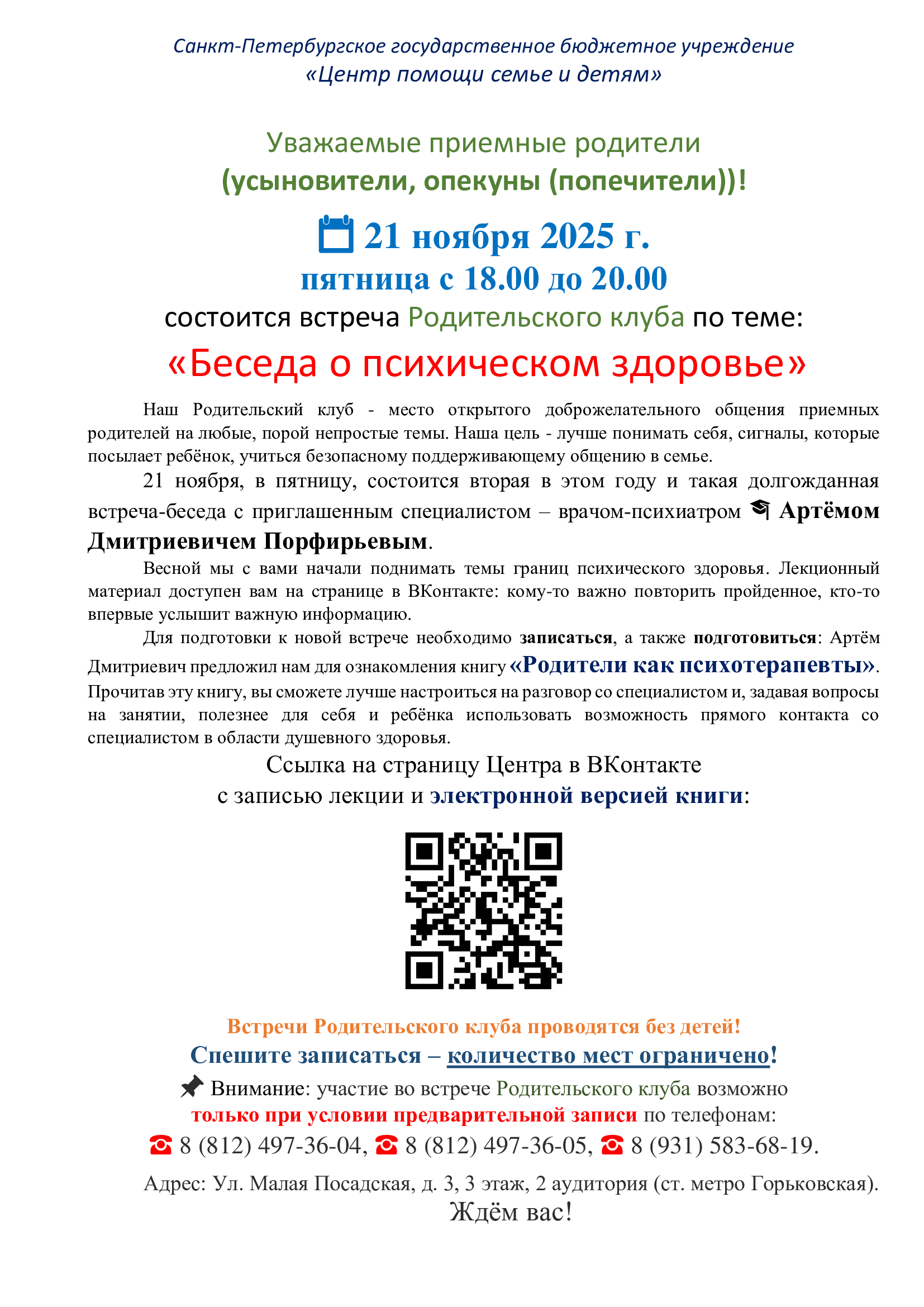 приемных родителей (усыновителей, опекунов, попечителей) принять участие во встрече Родительского клуба. 📆 В пятницу 7 ноября ⌚ с 18-00 до 21-00. Тема встречи: «Эмоции и чувства в жизни приемной семьи». Опубликовано 05.11.2025 в рубрике Новости, Участие в осуществлении деятельности по опеке и попечительству