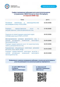 График проведения вебинаров для налогоплательщиков сотрудниками УФНС России по Санкт-Петербургу в 1 квартале 2026 года Опубликовано 16.01.2026 в рубрике Федеральная налоговая служба