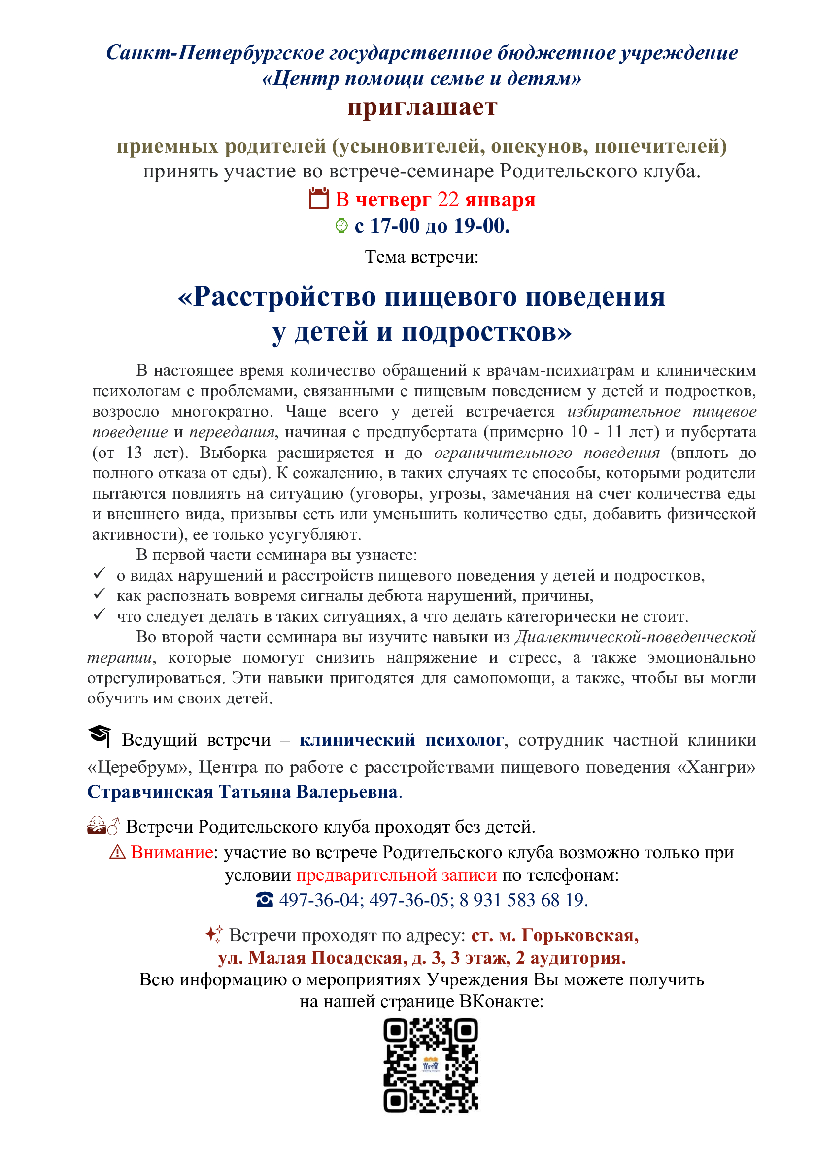 Санкт-Петербургское государственное бюджетное учреждение «Центр помощи семье и детям» приглашает приемных родителей (усыновителей, опекунов, попечителей) принять участие во встрече-семинаре Родительского клуба. 📆 В четверг 22 января ⌚ с 17-00 до 19-00. Тема встречи: «Расстройство пищевого поведения у детей и подростков»