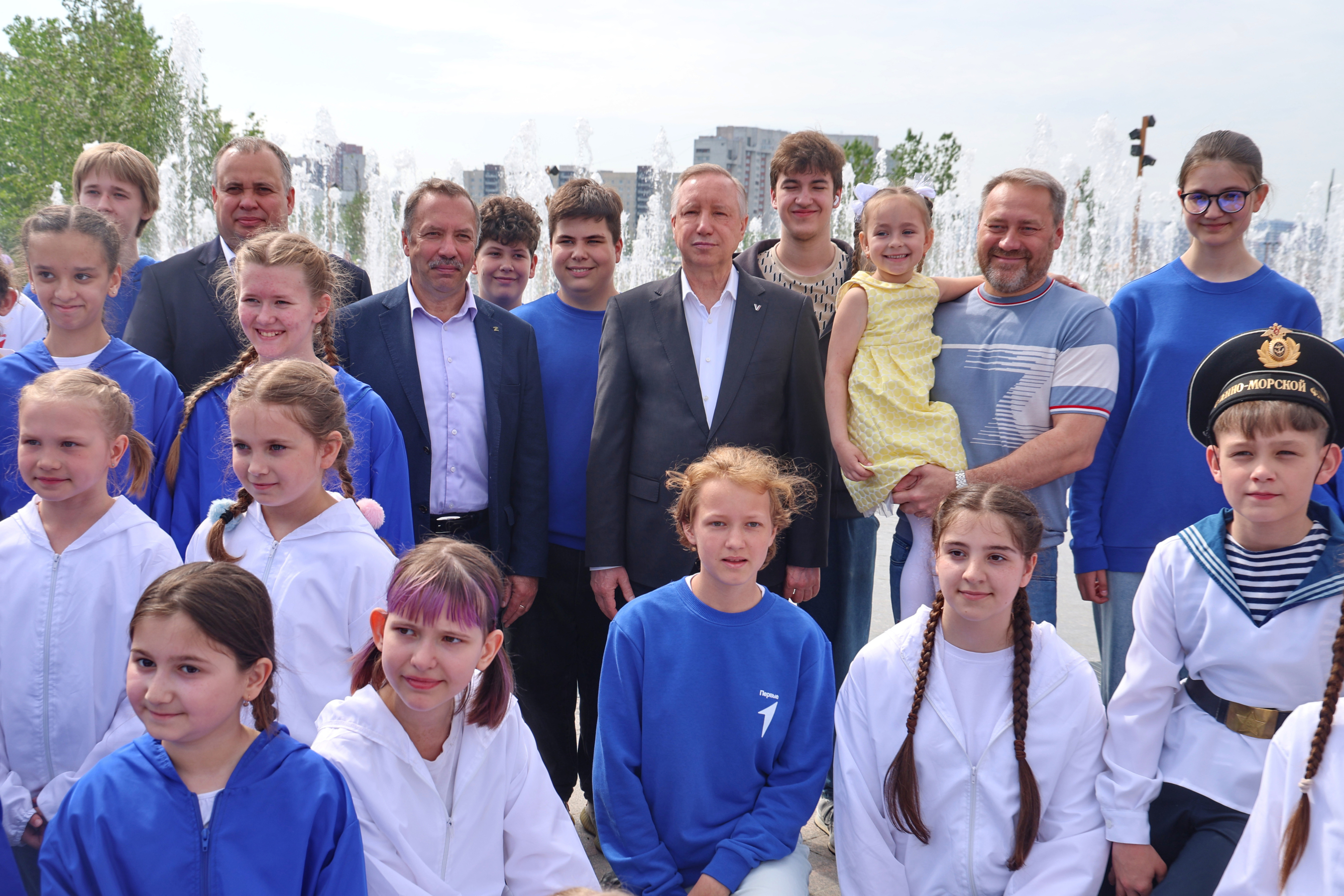 Санкт-Петербург, 29 мая 2025 года. Александр Беглов и Александр Бельский запустили новый светомузыкальный фонтан в Линейном парке на Васильевском острове.