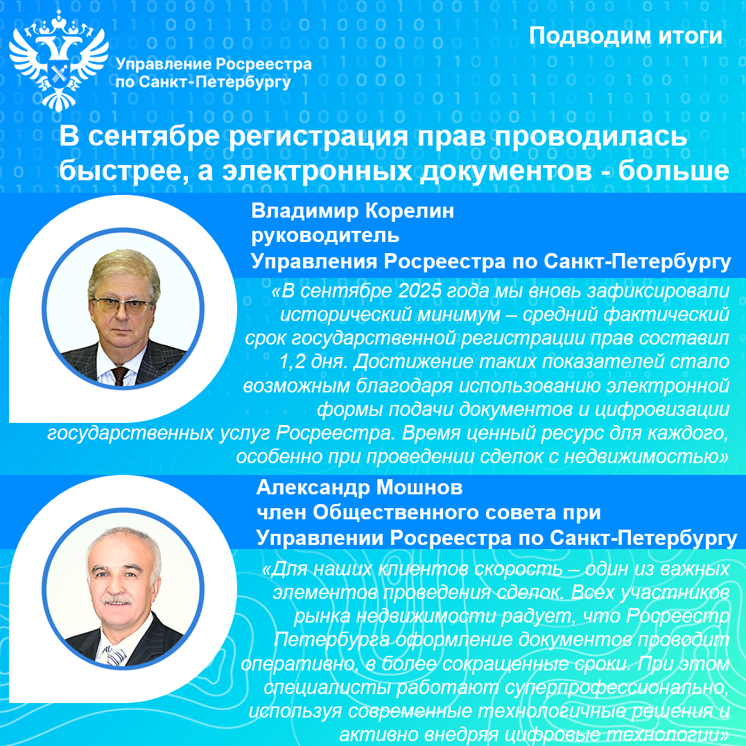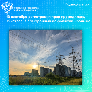 Росреестр Петербурга: в сентябре регистрация прав проводилась быстрее, а электронных документов стало больше Опубликовано 16.10.2025 в рубрике Информация Росреестра
