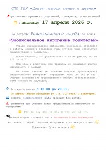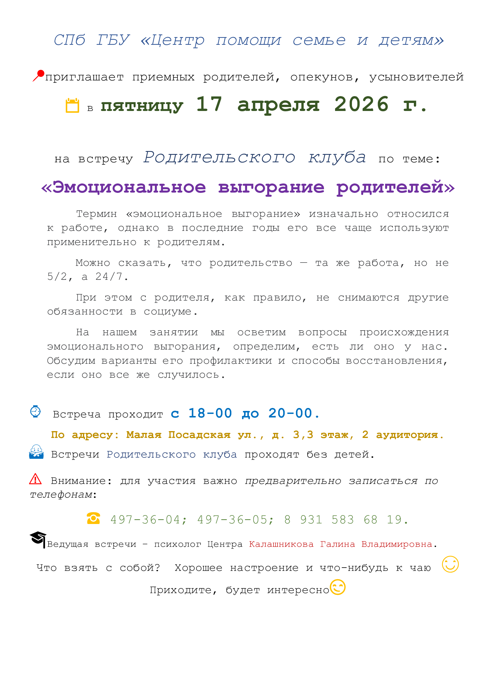 СПб ГБУ «Центр помощи семье и детям» 📍приглашает приемных родителей, опекунов, усыновителей 📆 в пятницу 17 апреля 2026 г. на встречу Родительского клуба по теме: «Эмоциональное выгорание родителей» Опубликовано 14.04.2026 в рубрике Участие в осуществлении деятельности по опеке и попечительству